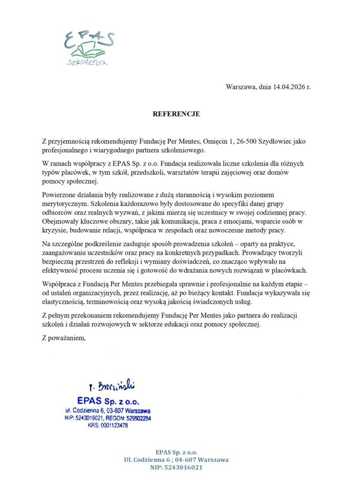 Rekomendujemy Fundację Per Mentes za profesjonalną realizację szkolenia… Szkolenie było odpowiedzią na realne potrzeby kadry pedagogicznej…