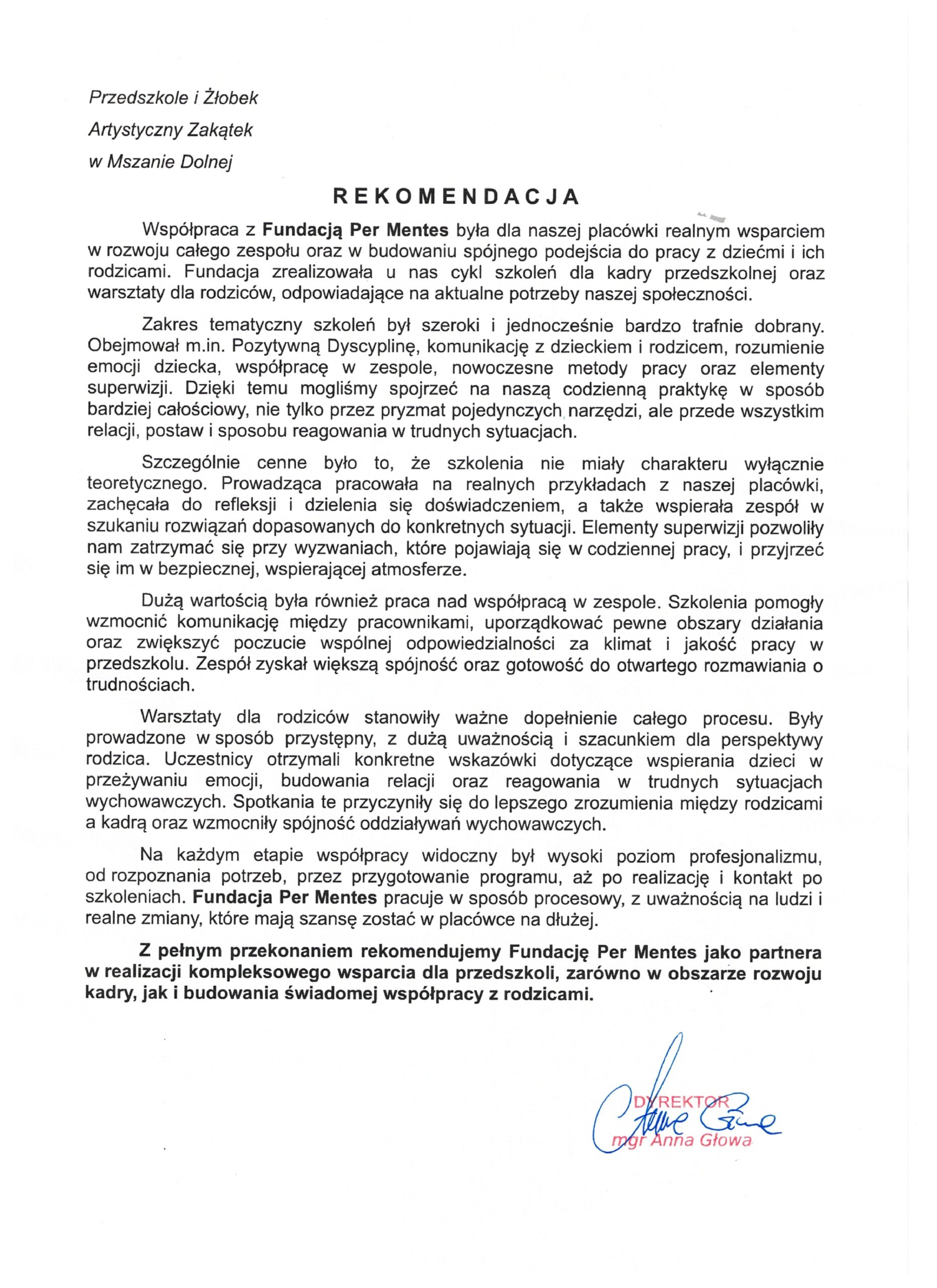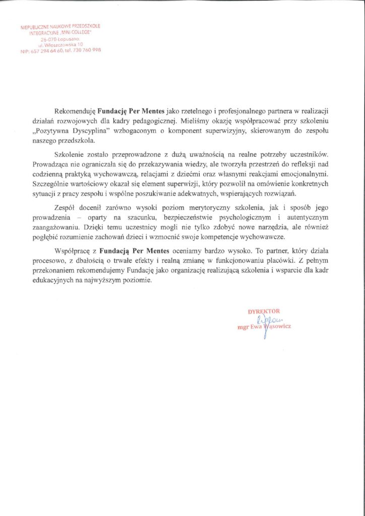 Współpraca z Fundacją Per Mentes była dla naszej placówki realnym wsparciem w rozwoju całego zespołu oraz budowaniu spójnego podejścia do pracy z dziećmi i ich rodzicami.
