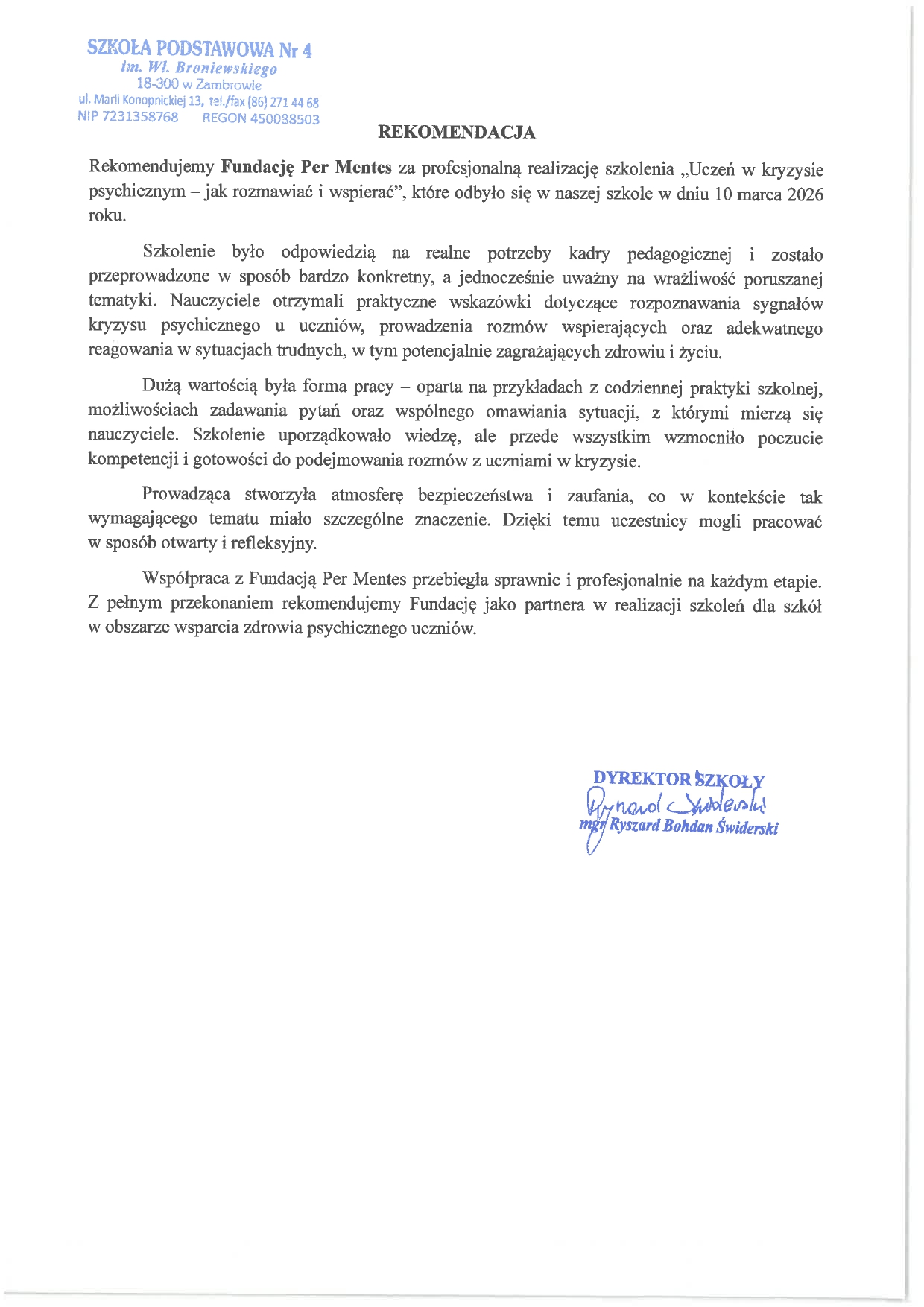 Rekomenduję Fundację Per Mentes jako partnera działań wspierających społeczność szkolną… Szkolenie dla kadry pedagogicznej było bardzo dobrze osadzone w realiach pracy szkolnej.