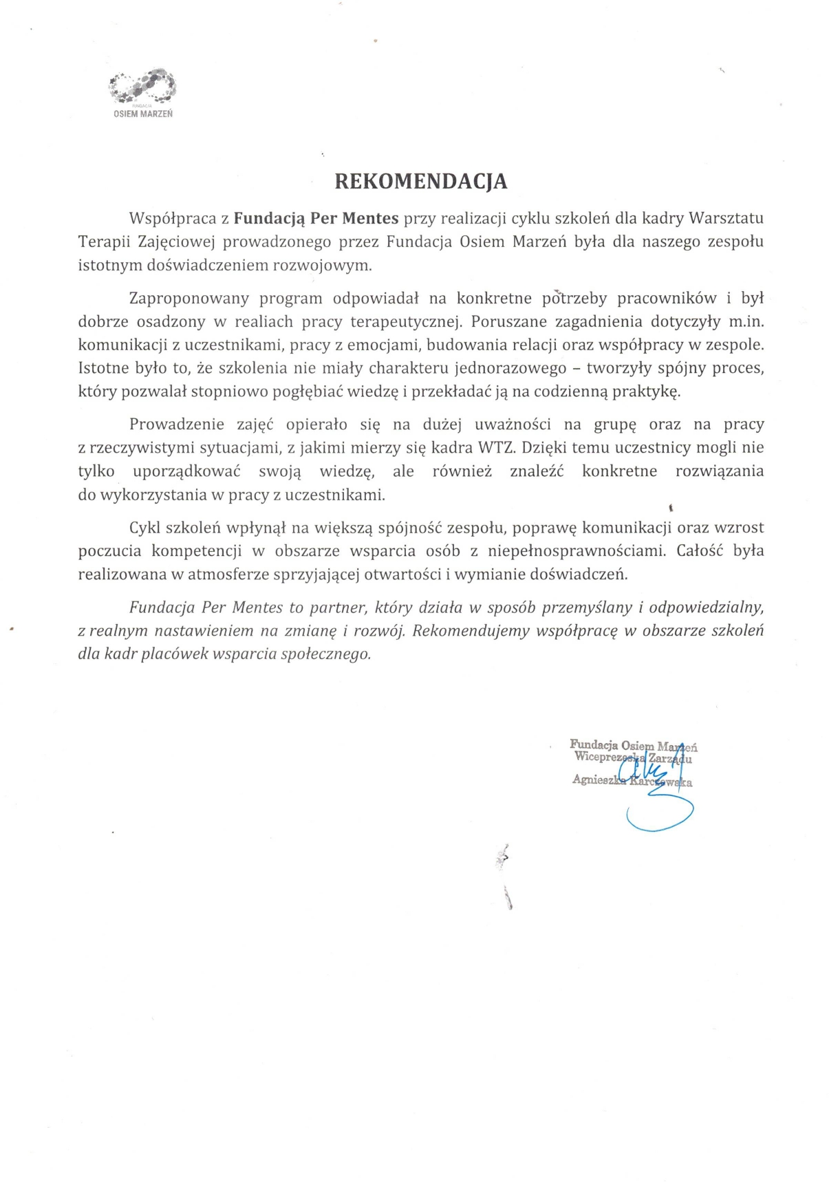 Współpraca z Fundacją Per Mentes przy realizacji cyklu szkoleń dla kadry WTZ prowadzonego przez Fundację Osiem Marzeń była dla naszego zespołu istotnym doświadczeniem rozwojowym.